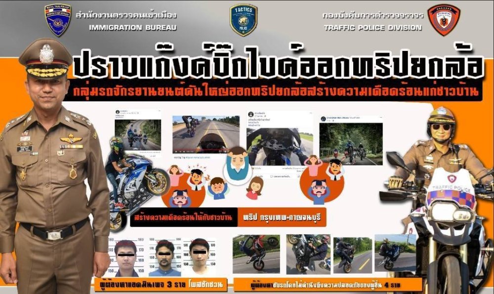 จากนั้นเจ้าหน้าที่ตำรวจได้ร่วมกันสืบสวนขยายผลจนทราบว่า นายจิรายุทธ ทองสม , นายมนตรี อุ่นใจ ,นายจักราวุธ เปรมศรี และนายวายุ เพ็งสกุล ทั้ง 4 ราย เป็นผู้ขับขี่รถจักรยานยนต์คันใหญ่(บิ๊กไบค์) ยกล้อหน้า ที่ปรากฎหลักฐานตามคลิปและภาพถ่ายที่เผยแพร่ในโซเชียลมีเดีย ขับขี่รถในลักษณะประมาทหวาดเสียวและขับขี่รถโดยไม่คำนึงถึงความปลอดภัย ในชีวิตและทรัพย์สินของผู้อื่น มีบทลงโทษต้องระวางโทษจำคุกไม่เกินสามเดือน หรือ ปรับตั้งแต่สองพันบาทถึงหนึ่งหมื่นบาท หรือทั้งจำทั้งปรับ โดยได้นำส่งพนักงานสอบสวนดำเนินการต่อไป โดยรายอื่นที่ปรากฎตามคลิปจะสืบสวนขยายผลดำเนินคดีกับทุกราย