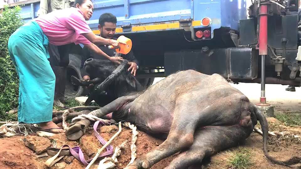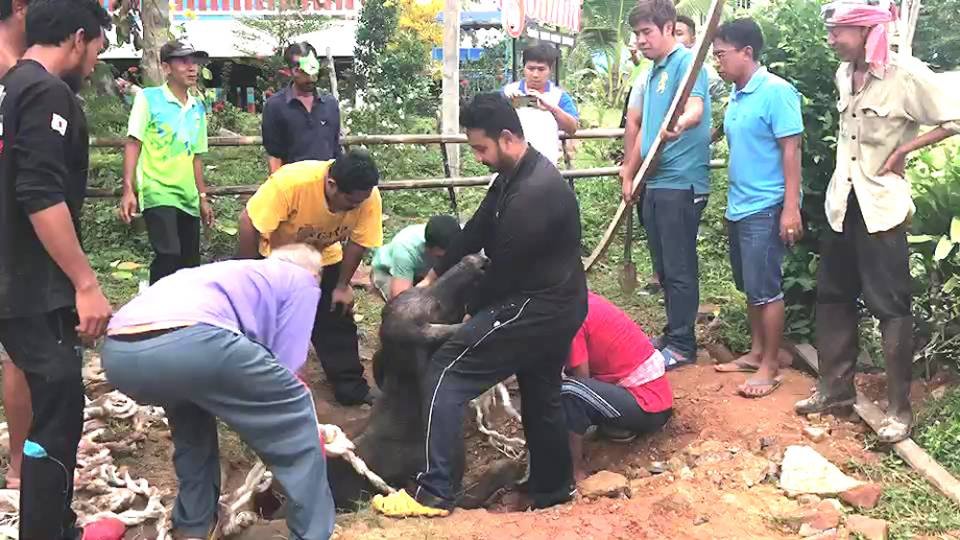 นายดำรงค์ ติงหะ รองผู้จัดการทั่วไป ห้างโรบินสัน สาขาตรัง พบควายเพศเมีย อายุ 35 ปี หนักประมาณ 300 กิโลกรัม ตกคูระบายน้ำ ที่หน้าเรือนนภัสรีสอร์ท บนเกาะสุกร อำเภอปะเหลียน จังหวัดตรัง จึงประสาน นางราตรี จิตรหลัง นายก อบต.เกาะสุกร และผู้นำชุมชน นำชาวบ้านไปช่วยเหลือ โดยแม่ควายมีสภาพอ่อนเพลีย เพราะตกลงไปในคูระบายน้ำเป็นเวลานาน เบื้องต้นระดมเครื่องมือในท้องถิ่นเพื่อดึงร่างขึ้นมา