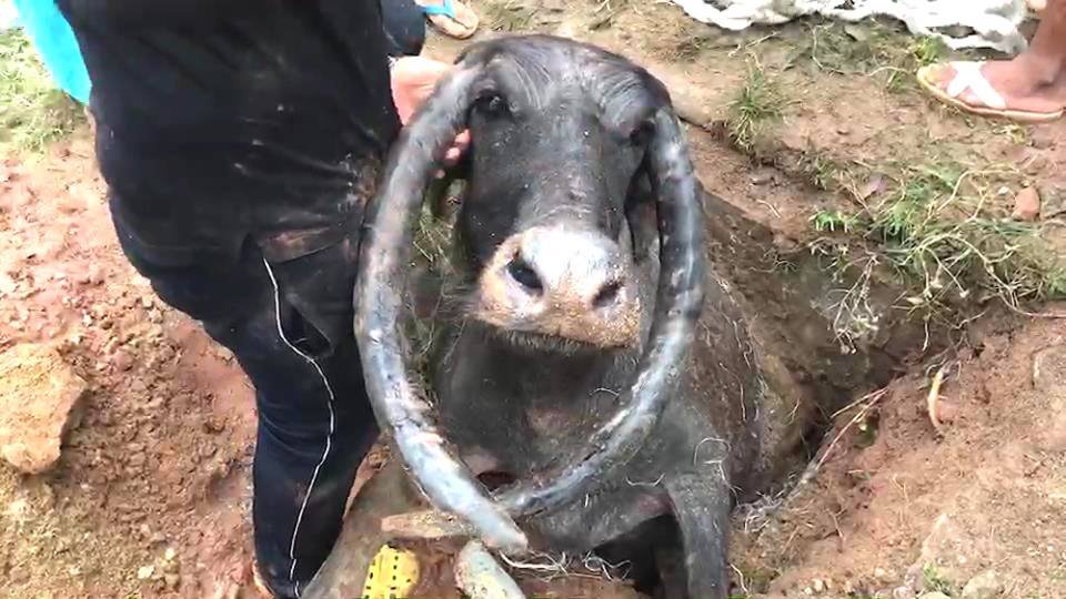 ระดมช่วย เจ้าแง็กควายนางงามซุปเปอร์สตาร์เกาะสุกร ที่ตกคูระบายน้ำ นานหลายชั่วโมงกว่าจะนำร่างขึ้นมาได้
