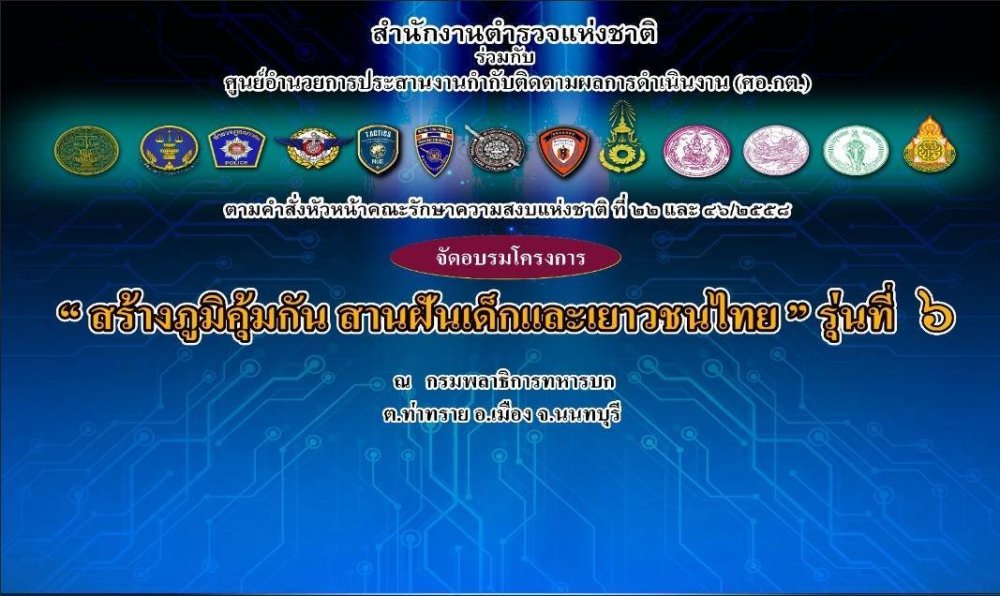 สำนักงานตำรวจแห่งชาติ โดย ศูนย์ปราบปรามอาชญากรรมทางเทคโนโลยีสารสนเทศ (TACTICS) สำนักงานตรวจคนเข้าเมือง ศูนย์อำนวยการประสานกำกับติดตามผลการดำเนินงานตามคำสั่ง คสช.ที่ ๒๒และ ๔๖/๒๕๕๘ และกองบังคับการตำรวจจราจร ได้จัดอบรมหลักสูตร “สร้างภูมิคุ้มกันสานฝันเด็กและเยาวชนไทย”รุ่นที่ 6
