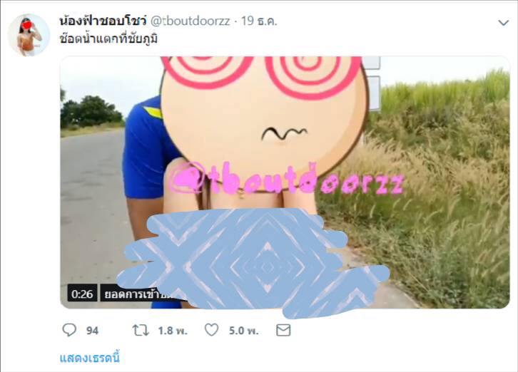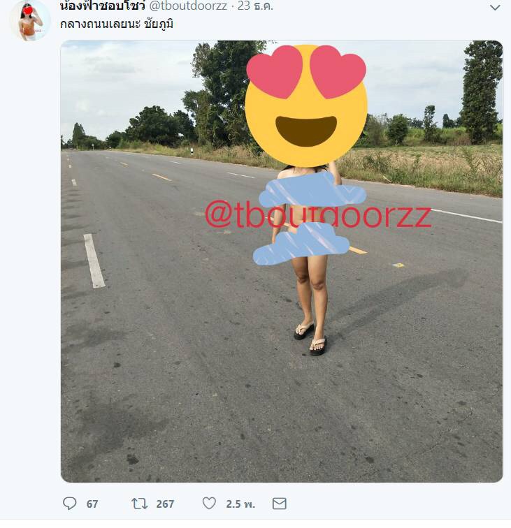 และมีการนำไปเผยแพร่ผ่านโลกโซเชียล ผ่านทางทวิตเตอร์ หรือ สื่อโซเซียล แชร์ภาพตัวหญิงสาวรายนี้เอง โชว์ภาพสยิวทั้งเปลือยกาย และมีเพศสัมพันธุ์เป็นคลิปเคลื่อนไหวยาวหลายนาทีบริเวณริมถนน ที่มีป้านระบุว่าเป็นพื้นที่อ.จัตุรัส จ.ชัยภูมิ ซึ่งสร้างความเสียหายให้กับจ.ชัยภูมิว่อนออกไปทั่วโลกโซเซียลในขณะนี้ โดยหญิงสาวรายนี้ระบุใช้ชื่อทวิตเตอร์ ชื่อ น้องฟ้าชอบโชว์ หรือ @tboutdoorzz