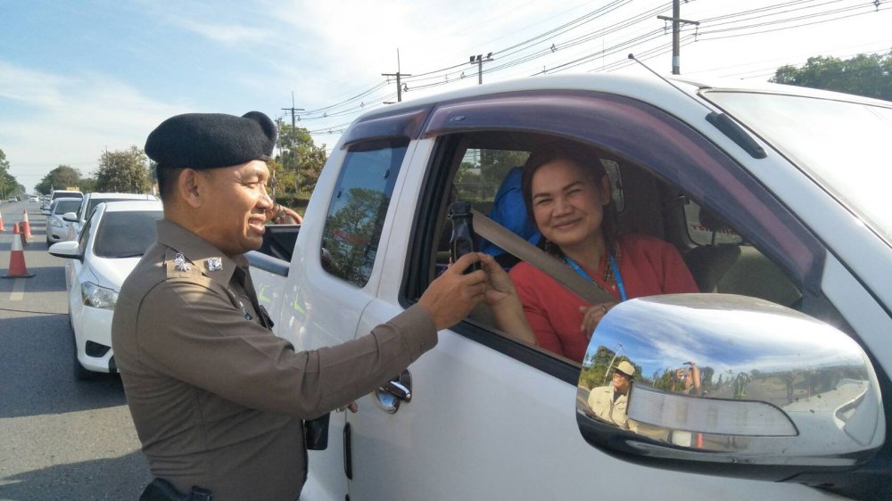 ตำรวจกาฬสินธุ์แจกน้ำหวาน แก้ง่วงให้ประชาชนขับรถกลับปลอดภัย
