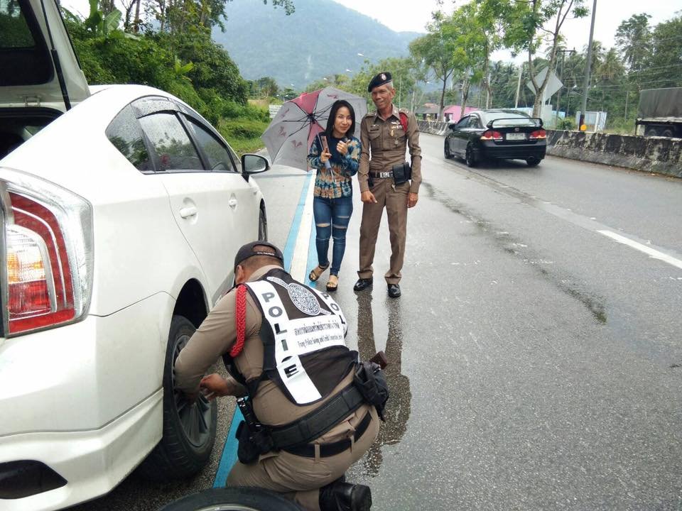 หญิงสาวโพสต์ข้อความ ซึ้งน้ำใจตำรวจ สภ.นาโยง จ.ตรัง หลังช่วยเปลี่ยนยางรถยนต์ที่แบน