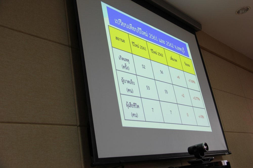 นาย สุปกิต โพธิ์ปภาพันธ์ ผู้ว่าราชการจังหวัดลพบุรี สรุปผลการดำเนินงาน ของศูนย์อำนวยการป้องกันและลดอุบัติเหตุทางถนน ช่วงเทศกาลปีใหม่ พ.ศ. 2562 ผ่านศูนย์ประจำอำเภอ ทั้ง 11 อำเภอของจังหวัดลพบุรี ในช่วงรณรงค์ควบคุมเข้มข้น ระหว่างวันที่ 27 ธันวาคม 2561 ถึงวันที่ 2 มกราคม 2562