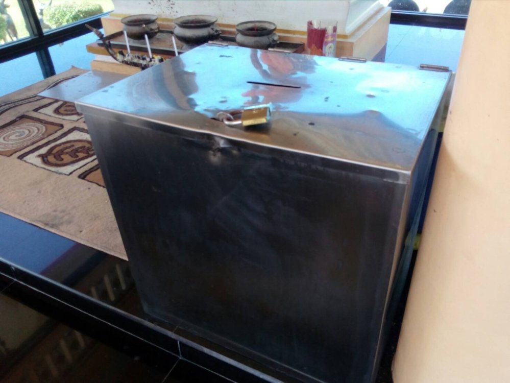 กล่องตู้บริจาคซึ่งเป็นอลูมิเนียม 2 ตู้ ปากกล่องเปิดโดยที่แม่กุญแจยังติดอยู่ล้วงเอาเงินในตู้ไป