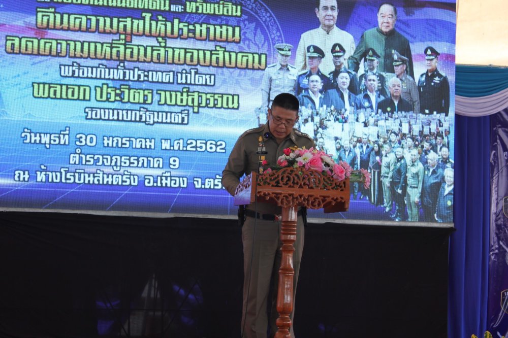 พล.ต.ท.รณศิลป์ ภู่สาระ ผู้บัญชาการตำรวจภูธรภาค 9 มอบโฉนดที่ดินคืนแก่ลูกหนี้ เป็นการคืนความสุขให้แก่ประชาชน ลดความเหลื่อมล้ำในสังคม ตามนโยบายของรัฐบาล ครั้งที่ 7 ในส่วนของ 7 จังหวัดภาคใต้ตอนล่าง ซึ่งมีผู้แทนส่วนราชการที่เกี่ยวข้องทั้ง 7 จังหวัด ประชาชนผู้เข้ารับมอบโฉนด จำนวน 91 คน เป็นคนจังหวัดตรัง 18 คน หัวหน้าสถานีตำรวจ 4 จังหวัด (ยกเว้นยะลา,ปัตตานี,นราธิวาส) จำนวน 73 นาย และผู้เข้าร่วมงาน ประมาณ 500 คน