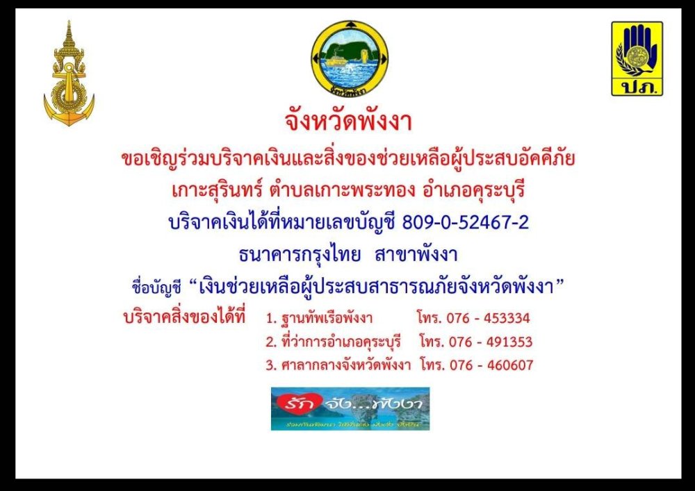 นายศิริพัฒ พัฒกุล ผวจ.พังงา พร้อมด้วยนายสายัญ กิจมะโน ป้องกันบรรเทาสาธารณภัยจังหวัดพังงา ฐานทัพเรือพังงา กองเรือภาค 3 ร่วมกันประชาสัมพันธ์ขอรับบริจาคเงินและสิ่งของช่วยเหลือผู้ประสบอัคคีภัย แก่ชาวมอแกนเกาะสุรินทร์ ต.เกาะพระทอง อ.คุระบุรี จ.พังงา โดยสามารถบริจาคเงินได้ที่หมายเลขบัญชี 809-0-52467-2 ธนาคารกรุงไทย สาขาพังงา ชื่อบัญชี “เงินช่วยเหลือผู้ประสบสาธารณภัยจังหวัดพังงา” ส่วนสิ่งของบริจาคได้ที่ ฐานทัพเรือพังงา โทร.076-453334 ที่ว่าการอำเภอคุระบุรี โทร.076-491535 ศาลากลางจังหวัดพังงา โทร.076-460607