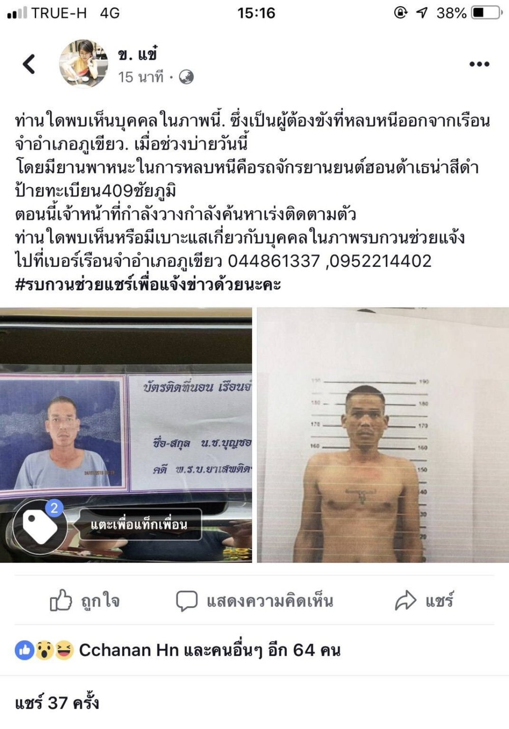 ระดม จนท.2จว.เร่งไล่ล่าผู้ต้องขังแหกคุกเรือนจำภูเขียวจี้ชิงจยย.ชาวบ้านหนีล่าสุดจนท.ในเขตรอยต่อ 2 จังหวัด ทั้งชัยภูมิและขอนแก่น ระดมกำลังช่วยกันเข้าปิดล้อมตรวจสอบบ้านผู้ต้องขังรายนี้แล้ว ญาติบอกยังไม่พบกลับมาบ้าน จนล่าสุดจนท.ชุดไล่ล่าในพื้นที่จ.ชัยภูมิอีกชุด จับกุมได้แล้ว