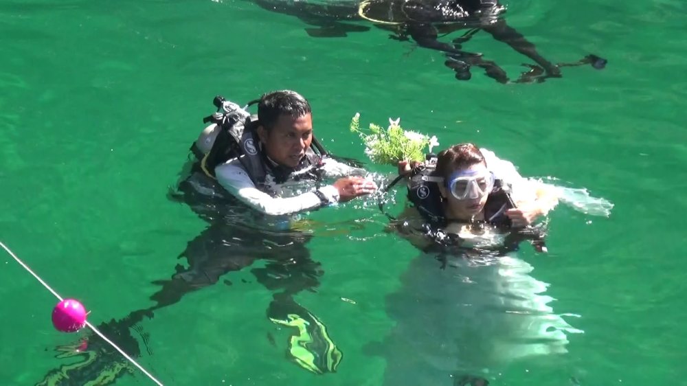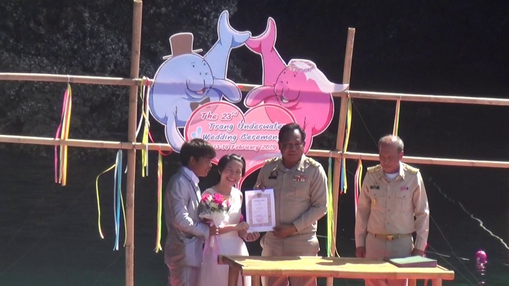 คู่บ่าวสาวดำดิ่งลงทะเลจดทะเบียนสมรสใต้สมุทรทะเลตรังแม้ทะเลที่เค็มก้หวานขึ้นทันตา เมื่อ 19 คู่รักดำดิ่งสู่ท้องทะเลสมรสจดทะเบียนใต้น้ำและรดทรายสังข์