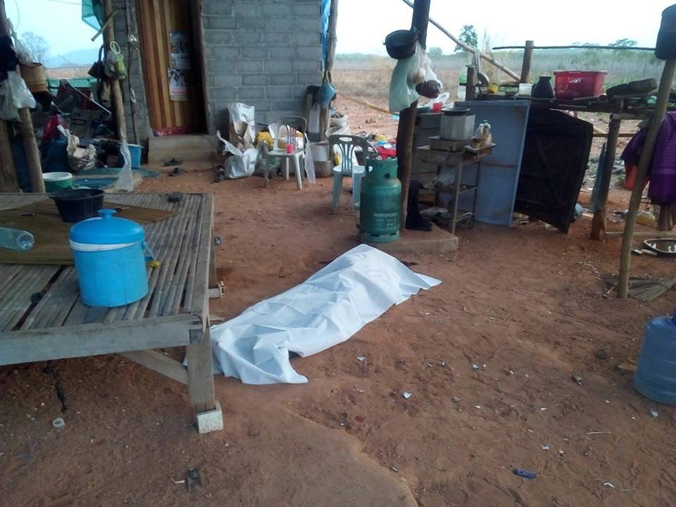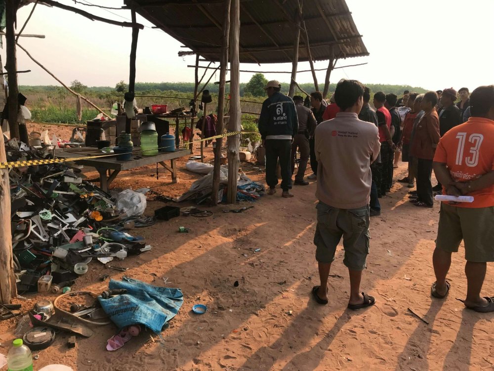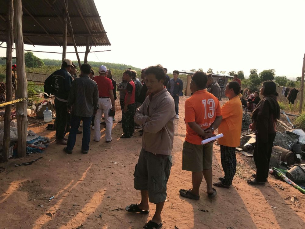 จาการสอบถามนางดวง จุฬาฤทธิ์ อายุ 46 ปี ภรรยาผู้เสียชีวิต ทราบว่า ก่อนเกิดเหตุเมื่อเช้าช่วงเวลาประมาณ 06.10 น.นายไป่ ชมพูราช (เตี้ย) ซึ่งเป็นสามีใหม่ ที่อยู่กินกันมาประมาณ 3 ปี กำลังนั่งอยู่ด้วยกันบนเตียงแคร่ไม้ไผ่ โดยสามีกำลังใช้ขวานลับกับหินอยู่ เพื่อเตรียมเดินทางออกไปรับซื้อของเก่าเป็นประจำทุกวัน สักครู่ตนก็ได้ยินเสียงปืนดังขึ้นจำนวน 1 นัด ก่อนที่จะเห็นสามีตกจากเตียงไปนอนกองอยู่ที่พื้น พร้อมมีเลือดไหลพุ่งออกจากศีรษะ และตนได้เหลือบเห็นผู้ชายใส่ชุดดำแขนยาวสวมหมวกอีโม่ง วิ่งถือปืนออกไปจากที่เกิดเหตุมุ่งสู่ป่ายูตาลิตัส ตนจึงร้องตะโกนให้พี่ชายและเพื่อนบ้านข้างเคียงมาช่วย แต่สามีตัวเองก็เสียชีวิตคาที่