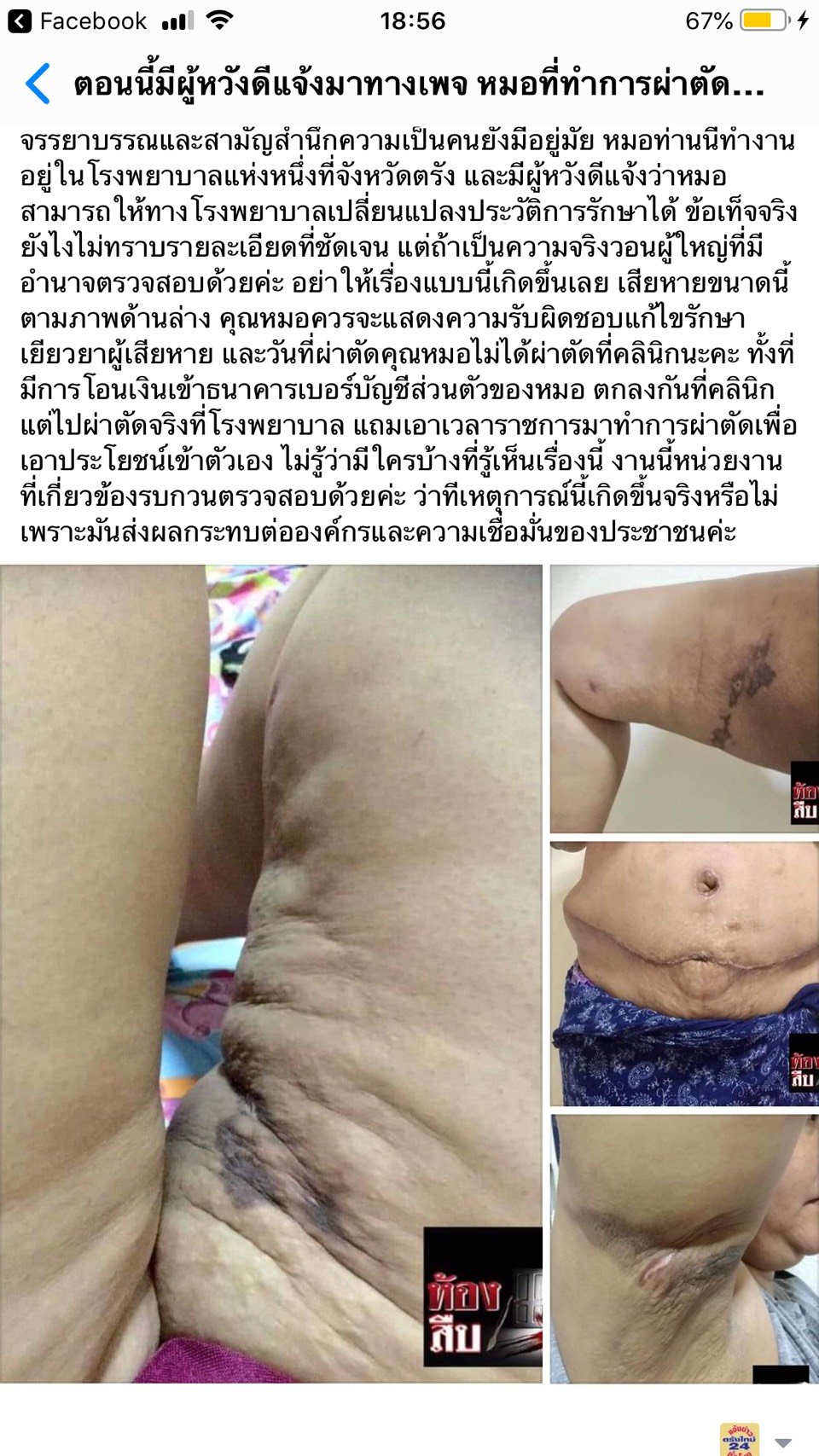 ผู้สื่อข่าวรายงานว่าเมื่อวันนี้ 24 ก.พ.2562 ที่ จ.ตรัง น.ส.แนน (นามสมมุติ) อายุ 38 ปี ทำธุรกิจร้านอาหารชื่อดังเมืองตรัง ได้เดินทางมาพร้อมสามีเพื่อร้องทุกข์ผ่านสื่อ ว่าตนเคยไปใช้บริการโบท็อกซ์ที่คลินิกศัลกรรมเสริมความงามแห่งหนึ่งใน จ.ตรัง ครั้งแรกมีความรู้สึกว่าโอเค หลังจากนั้นอยากดูดไขมันจึงเข้าไปศึกษาที่คลินิกดูว่าที่ไหนคุณหมอจะแนะนำที่ไหนได้บ้าง คุณหมอบอกว่าที่คลินิกแห่งนี้ก็มีและได้อีกว่าเหตุผลที่ควรจะทำ คือหนึ่งมันใกล้บ้านมันสะดวกหลายๆ อย่าง และคุณหมอก็มีความชำนาญก็เลยตัดสินใจที่จะทำ และคุณหมอแนะนำให้เพิ่มการผ่าตัดช่วงหน้าท้องด้วย เพราะว่าหน้าท้องใหญ่ เมื่อวันที่ 6 ก.ย.2561 ที่ผ่านมา