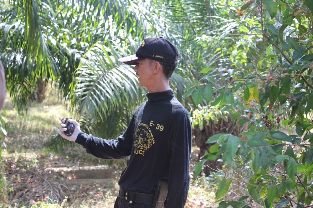 ถึงที่เกิดเหตุ พบชาวบ้านจำนวนมาก ยืนมุงดูเหตุการณ์อยู่บริเวณสะพานดังกล่าว ก่อนจะทำการปิดกั้นสถานที่ ห้ามผู้ที่ไม่เกี่ยวข้องเข้าใกล้รัศมี 100 เมตร ขณะที่วัตถุคล้ายระเบิดดังกล่าวอยู่ภายในลำคลองใต้สะพานดังกล่าว ขนาดลำคลองกว้างประมาณ 40 เมตร ระดับน้ำที่อยู่ภายในลำคลองมีเพียงเล็กน้อย ลึกประมาณ 15 ซม.เจ้าหน้าที่หน่วยเก็บกู้วัตถุระเบิด (EOD) ได้ทำการลงไปตรวจสอบ พบว่าเป็นระเบิดมือ เอ็ม 26 สภาพสมบูรณ์พร้อมใช้งาน พันด้วยสก๊อตเทปกาวสีดำ เจ้าหน้าที่จึงได้นำขึ้นมาตรวจสอบ ก่อนจะนำไปทำลายทิ้งภายในสวนปาล์มน้ำมันที่อยู่ใกล้กับลำคลอง