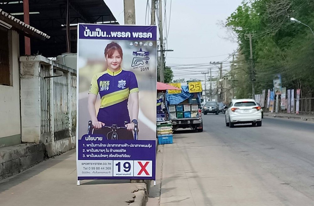 โดยป้ายดังกล่าว ระบุข้อความว่า “ปั่นเป็น..พรรค พรรค” นโยบาย 1.พาปั่นทางไกล ปราสาทสายฟ้า-ปราสาทพนมรุ้ง 2.พาปั่นสบายๆ ใน ช้างเซอร์กิต 3.พาปั่นแบบโหดๆ สไตล์ไครทีเรียม พร้อมกับมีหมายเลข 19 กากบาทสีแดง และมีภาพหญิงสาวสวยอยู่บนป้ายด้วย