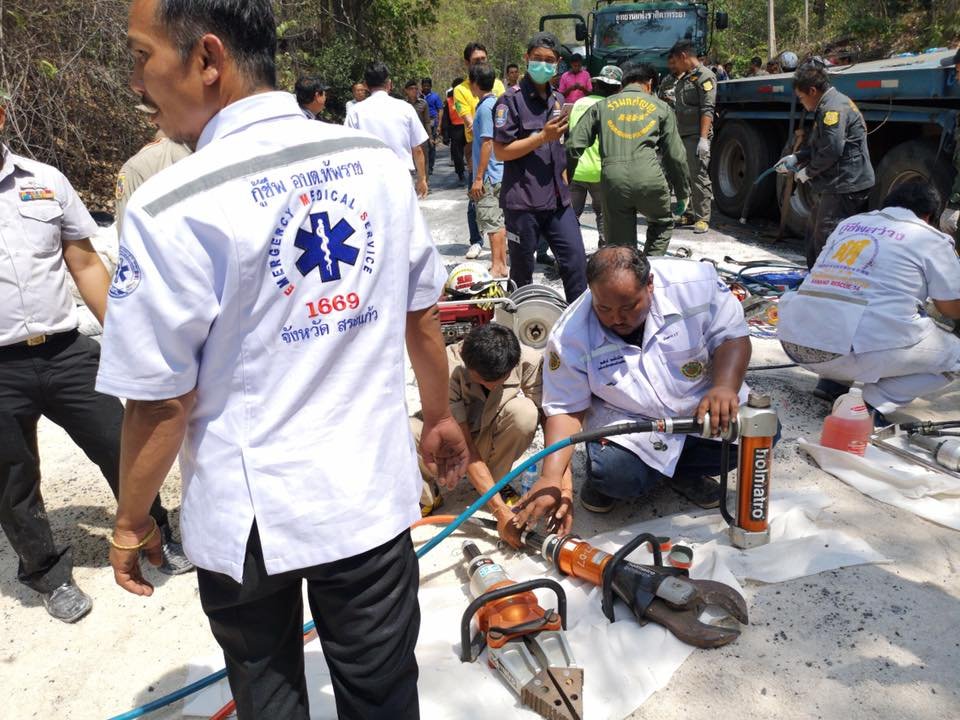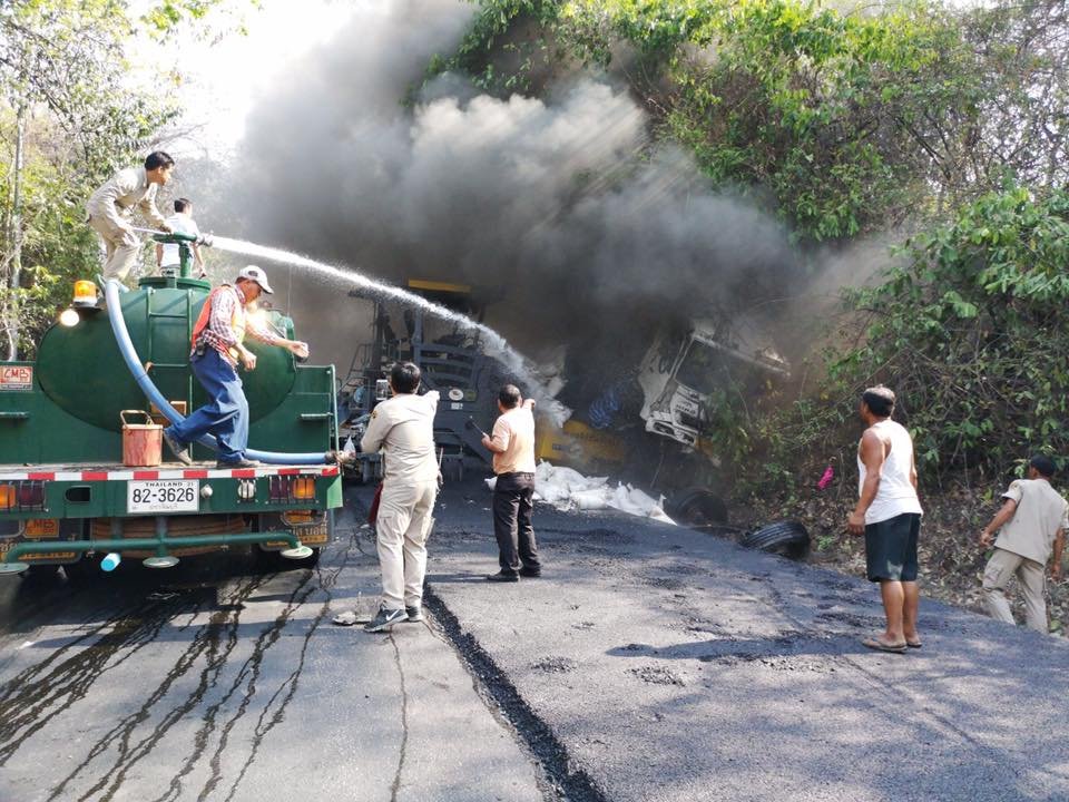 พ.ต.ท.นพพิมาน กล่าวว่า ได้รับแจ้งจากกู้ชีพทัพราช ว่าเกิดอุบัติเหตุ รถเทนเลอร์บรรทุกเกลือ ยี่ห้อ ฮิโน สีขาว หมายเลขทะเบียน 70 _ 5862 ขอนแก่น เบรคแตกขณะวิ่งลงเขาช่องตะโก เฉี่ยวชนรถที่วิ่งขึ้นเขามารวม 7 คัน 1 ใน 7 คันเป็นรถเก๋งวอลโว่ สีเขียว ถูกรถเทนเลอร์ทับแหลกคาใต้ท้องรถเทรลเลอร์แล้วไฟลุกไหม้คอกคนในรถตายคาที่ ขณะนี้ยังไม่ทราบว่ามีผู้โดยสารอยู่ในรถกี่คน เบื้องต้นนำ ศีรษีออกมาได้เพียงอย่างเดียว ส่วนศพที่เหลือที่อยู่ใต้ท้องรถเทนเลอร์เป็นคนงานก่อสร้างทาง บริษัทเอส.พีพีชีวิลกรุ๊ป จำกัด รายงานข่าวจะส่งเข้าไปในภายหลัง เบื้องต้นผู้บาดเจ็บที่นำส่งโรงพยาบาลตาพระยา มี 9 คน รวมถึงสาวท้องแก่ด้วย ผู้เสียชีวิต 3 คน 1.น.ส.กาญจนา แช่เรือง อายุ 19 ปีอยู่บ้านเลขที่ 31 หมู่ 8 ต.หนองกุรา อ.บางระกำ จ.พิษณุโลก อีก 2 คนไม่มีหลักฐาน