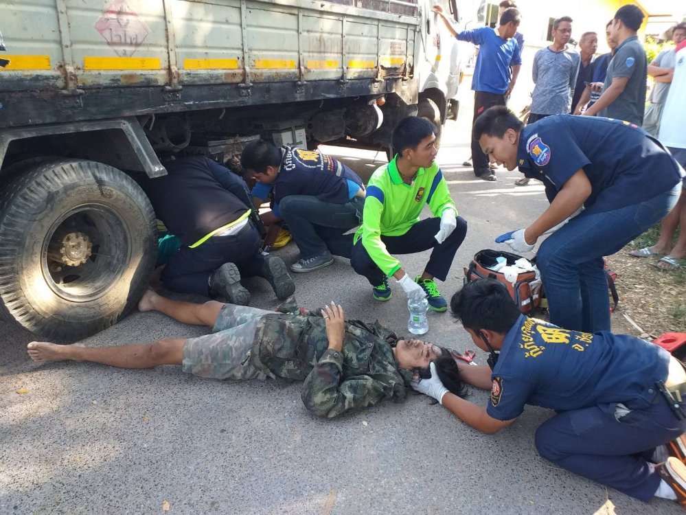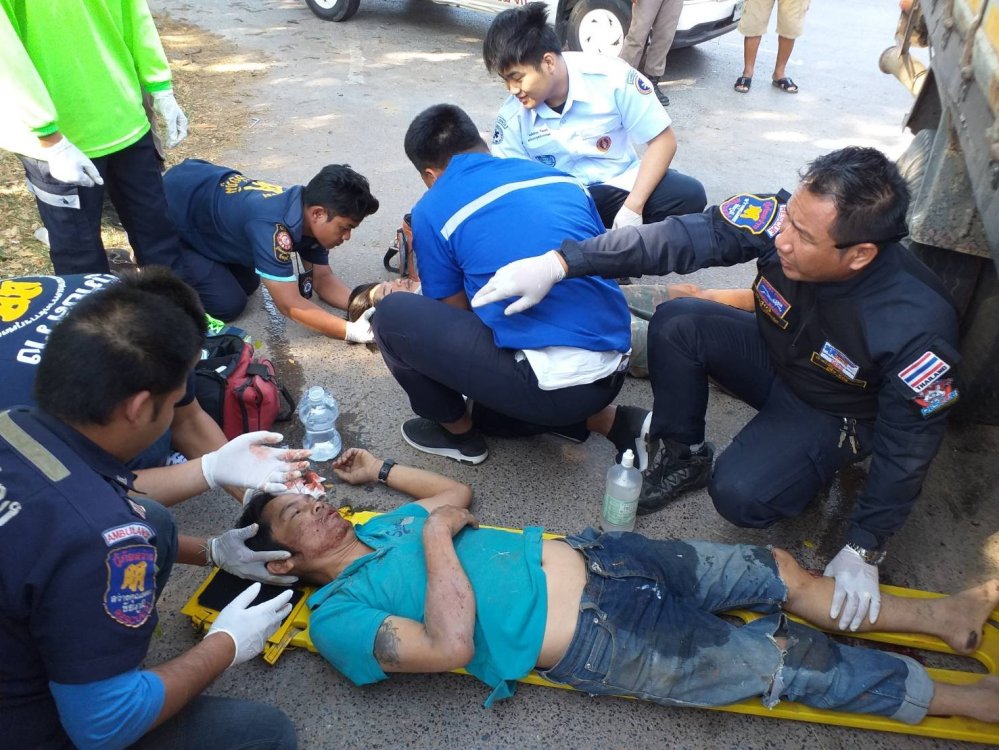 โชคดึที่คนขับรถบรรทุก 6 ล้อ ขณะเกิดเหตุได้หยุดจอดรถได้ทันก่ อนที่รถจะเหยียบทับร่างชายไทยทั้ง 3 คนที่นอนเรียงทับร่างกันติดอยู่ใต้ท้องรถ ชาวบ้านละแวกใกล้เคียงได้นำยาดมมาให้ชายไทยที่นอนหมดสติทั้ง 3 คนได้ดม ก่อน 1 คน จะฟื้นได้สติก่อนและชาวบ้านได้ช่วยกันนำร่างมาพักอยู่ใต้ต้นไม้บริเวณใกล้เคียง ก่อนที่เจ้าหน้าที่หน่วยกู้ภัยสว่างคุณธรรมชัยภูมิ จะมาช่วยกันนำร่างผู้ได้รับบาดเจ็บที่นั่งรถจักรยานยนต์มาด้วยกันทั้ง 3 คน ส่งรักษาตัวที่โรงพยาบาลชัยภูมิช่วยชีวิตเป็นการด่วน เพราะมี 2 ราย ขณะนี้ยังไม่ได้สติ ต้องรีบให้การช่วยชีวิตเป็นการด่วน ซึ่งชายไทยทั้ง 3 คน ที่นั่งซ้อนท้ายกันมาบนรถจักรยานยนต์ไม่ได้สวมหมวกกันน็อคทั้ง 3 คน และคนที่ได้สติมีอาการเมาสุรายังไม่สร่าง