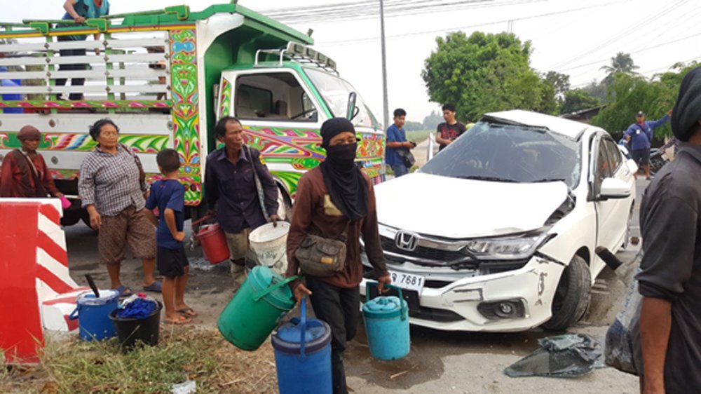 ระทึกครูสาวขับเก๋งตั้งจีพีเอสกลับบ้านตัดหน้าหกล้อคนงานตัดอ้อยชนสนั่นบาดเจ็บ7ราย