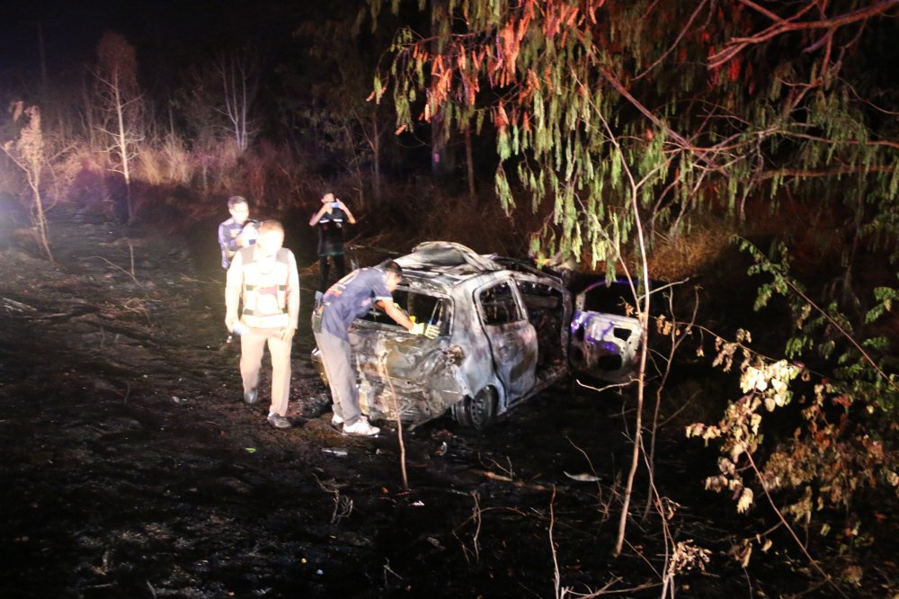 สอบถามไปยังนายบุญยัง หมื่นรักษา ให้การว่า ตนได้ขับรถบรรทุกไปส่งอ้อยที่โรงงานน้ำตาล ขากลับตนได้แวะจอดบริเวณปั๊มลาดใหญ่ พอทำธุระเสร็จตนเองก็ขับรถออกจากปั๊ม ไม่นานได้มองไปดูกระจกด้านหลัง พบรถเก๋งคันดังกล่าวขับมาด้วยความเร็ว พุ่งเข้ามาชนท้ายรถของตนอย่างจัง ก่อนตกลงไปข้างทาง ตนจึงรีบวิ่งลงไปช่วย แต่ช่วยไม่ได้ เนื่องจากประตูรถเก๋งล็อก ตนจึงรีบขับรถไปแจ้งเจ้าหน้าที่ ที่อยู่ห่างจากจุดเกิดเหตุราว 1 กม.ก่อนที่เจ้าหน้าที่จะแจ้งให้หน่วยกู้ภัยเข้าตรวจสอบ แต่ไม่ทันการณ์แล้ว รถเกิดระเบิดเสียงดังขึ้นและเกิดไฟลุกไหม้ท่วมทั้งคันอย่างรดเร็ว ก่อนย่างสดคนที่มาด้วยกันติดอยู่ภายในรถเก๋งทั้งหมดรวม 3 ศพในครั้งนี้