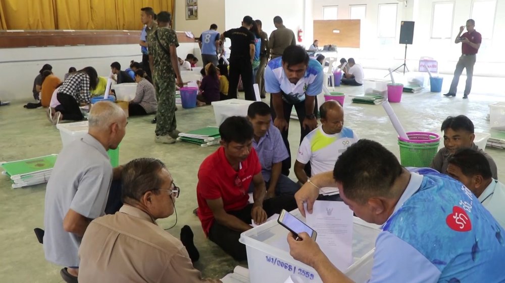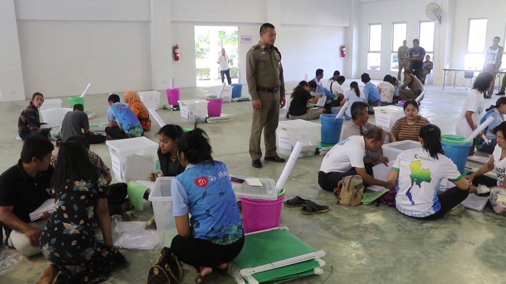 กรรมการประจำหน่วยรับบัตร หีบบัตร และอุปกรณ์การเลือกตั้ง ขณะประธานกกต.เขตพังงายันพร้อมรับสั่งเฝ้าระวังลมพายุพัดหน่วย