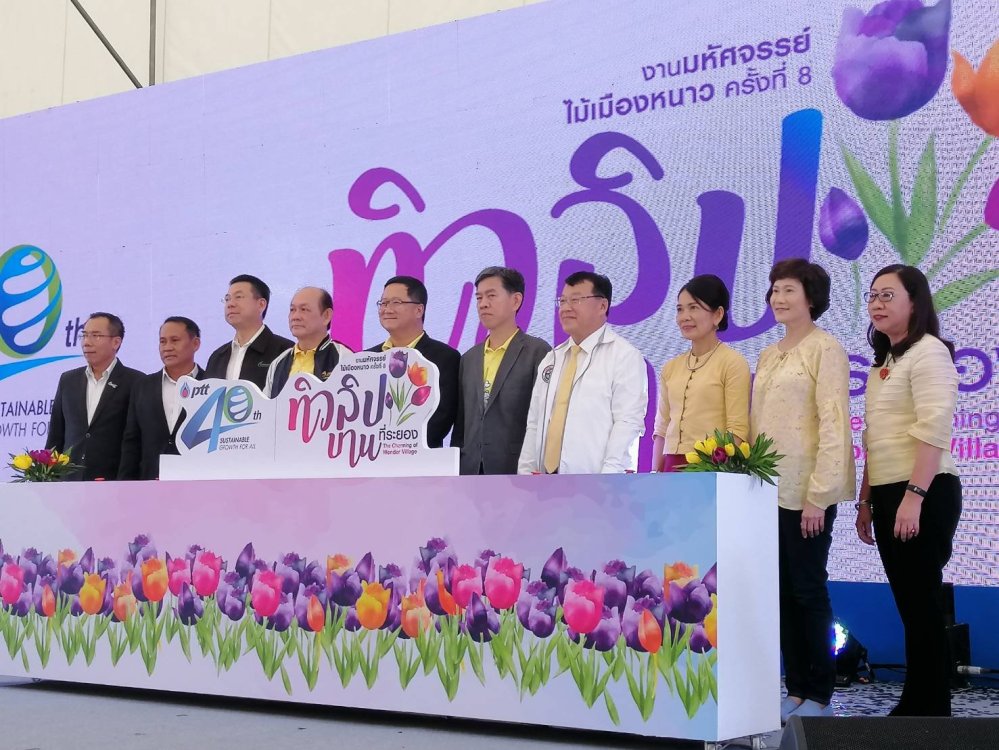 วันที่ 5 เมษายน ที่ สวนสมุนไพรสมเด็จพระเทพรัตนราชสุดาฯ สยามบรมราชกุมารี จ.ระยอง นายไพรินทร์ ชูโชติถาวร รมช.คมมาคม นายสุรศักดิ์ เจริญศิริโชติ ผู้ว่าราชการจังหวัดระยอง นายชาญศิลป์ ตรีนุชกร ประธานเจ้าหน้าที่บริหารและกรรมการผู้จัดการใหญ่ บริษัท ปตท. จากัด (มหาชน) ร่วมเปิดงานมหัศจรรย์ไม้เมืองหนาว ครั้งที่ 8 : ทิวลิปบานที่ระยอง เพื่อเชิญชวนพี่น้องชาวไทยพักผ่อนในช่วงเทศกาลสงกรานต์ ภายใต้แนวคิด “The Charming of Wonder Village” มนต์เสน่ห์หมู่บ้าน ในฝัน ท่ามกลางทุ่งทิวลิป และดอกไม้เมืองหนาวอันสวยงามตระการตา
