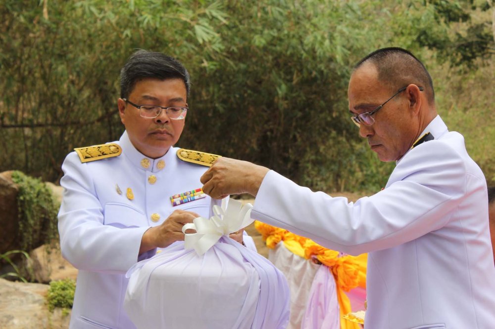 ที่บริเวณน้ำตกศักดิ์สิทธิ์ บ้านแก้งช้างเนียม ตำบลคำชะอี อำเภอคำชะอี จังหวัดมุกดาหาร นายชยันต์ ศิริมาศ ผู้ว่าราชการจังหวัดมุกดาหาร นำหัวหน้าส่วนราชการ ข้าราชการ ศาล อัยการ ทหาร ตำรวจพ่อค้า ประชาชนจิตอาสา ประกอบพิธีพลีกรรมตักน้ำศักดิ์สิทธิ์ โดยผู้ว่าราชการจังหวัดมุกดาหาร เป็นประธานถวายความเคารพ และเปิดกรวยกระทงดอกไม้หน้าพระบรมฉายาลักษณ์ สมเด็จพระเจ้าอยู่หัว จากนั้นผู้ว่าราชการจังหวัดมุกดาหารเดินไปยังโต๊ะบวงสรวง จุดธูปเทียนบูชา เพื่อประกอบพิธีพลีกรรมตักน้ำจากแหล่งน้ำศักดิ์สิทธิ์ พร้อมส่งให้ผู้บริหารระดับสูงร่วม ปักธูป ประกอบด้วย ผู้พิพากษาหัวหน้าศาลจังหวัดมุกดาหาร ผู้พิพากษาหัวหน้าศาลเยาวชนและครอบครัวจังหวัดมุกดาหาร นายศักดิ์สิทธิ์ สกุลลิขเรศสีมา รองผู้ว่าราชการจังหวัดมุกดาหาร นายศุภกร มูลสุวรรณ รองผู้ว่าราชการจังหวัดมุกดาหาร นายสุวิทย์ จันทร์หวร รองผู้ว่าราชการจังหวัดมุกดาหาร ผู้บังคับการกองกำลังรักษาความสงบเรียบร้อยจังหวัดมุกดาหาร ผู้บังคับการตำรวจภูธรจังหวัดมุกดาหาร ประธานแม่บ้านมหาดไทยจังหวัดมุกดาหาร หัวหน้าสำนักงานจังหวัด นายอำเภอคำชะอี นายกองค์การบริหารส่วนตำบลคําชะอี ร่วมปักธูป