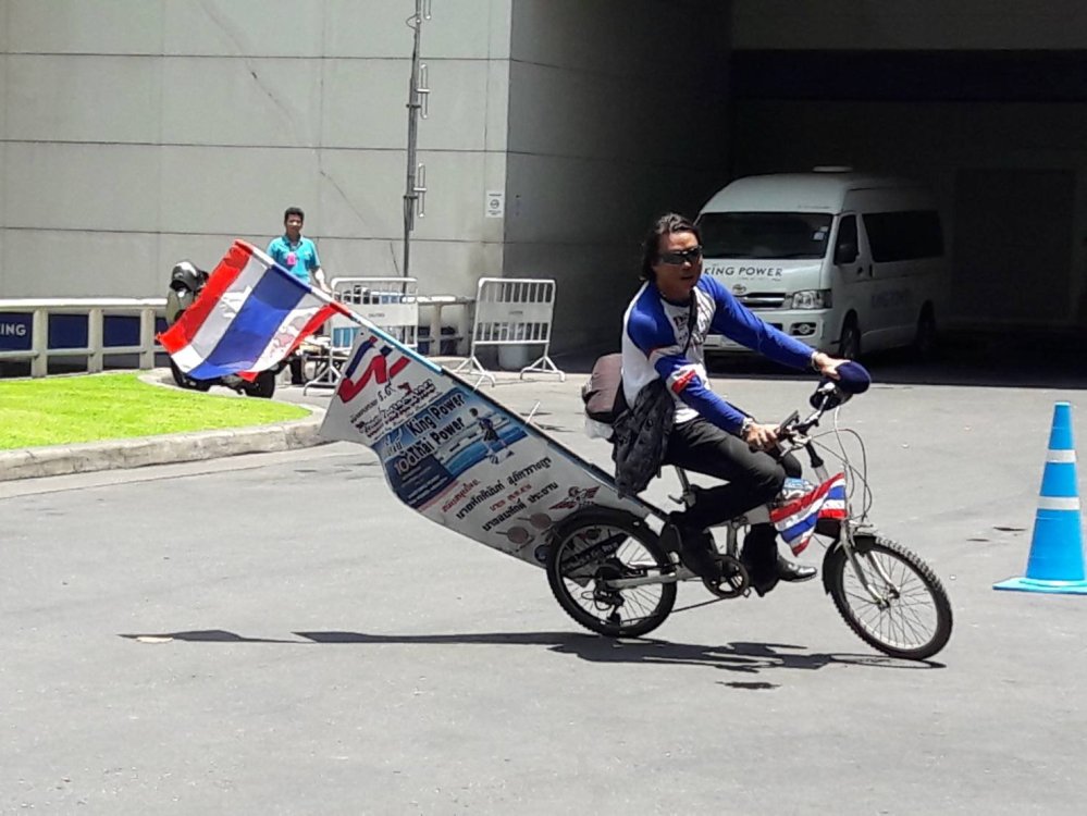 จากที่นายอาลาดิน นักปั่นหนุ่มใจงามได้ทำการปั่นจักรยานเดี่ยวคนเดียว จาก จ.สุรินทร์ -กรุงเทพมหานคร เป็นระยะทาง รวม 500 กม.จำนวนทั้งหมด 9 วัน ซึ่งเริ่มปั่นตั้งแต่วันที่ 1 เมษายน ที่ผ่านมา เพื่อจะมายื่นหนังสือขอสนามฟุตบอลจาก King Power เพื่อสานฝันให้น้องๆเยาวชนในจ.สุรินทร์ ได้มาถึงกรุงเทพมหานคร ในช่วงเช้าของวันนี้ โดยใช้เส้นทางถนนวิภาวดีรังสิต ตรงมายังแยกดินแดง และเข้าอนุสาวรีย์ชัยสมรภูมิ ซึ่งได้รับการ อำนวยความสะดวก จากเจ้าหน้าที่ตำรวจจราจร โครงการพระราชดำริ มาช่วยดูแลในด้านความปลอดภัยขณะปั่นเข้าเมืองตลอดเส้นทาง จนถึงจุดหมาย ซึ่งเป็นภาพที่น่าประทับใจ สำหรับประชาชนที่พบเห็น หลังจากถึงบริษัท คิงเพาเวอร์ นายอาลาดินได้ทำการยื่นหนังสือของ นายศักดิ์นันท์ สุภาวรกุล นายกองค์การบริหารส่วนตำบลยาง อ.ศีขรภูมิ จ.สุรินทร์ เพื่อขอสนับสนุนสนามฟุตบอล จาก King Power ให้กับเด็กๆที่รักกีฬาฟุตบอลแต่ขาดโอกาสที่จะมีสนามดีๆได้เล่น โดยมี คุณสุพรรณี ตันเอี่ยม เป็นตัวแทน บริษัทคิงเพาเวอร์ รับมอบหนังสือขอสนับสนุนสนามฟุตบอลในครั้งนี้